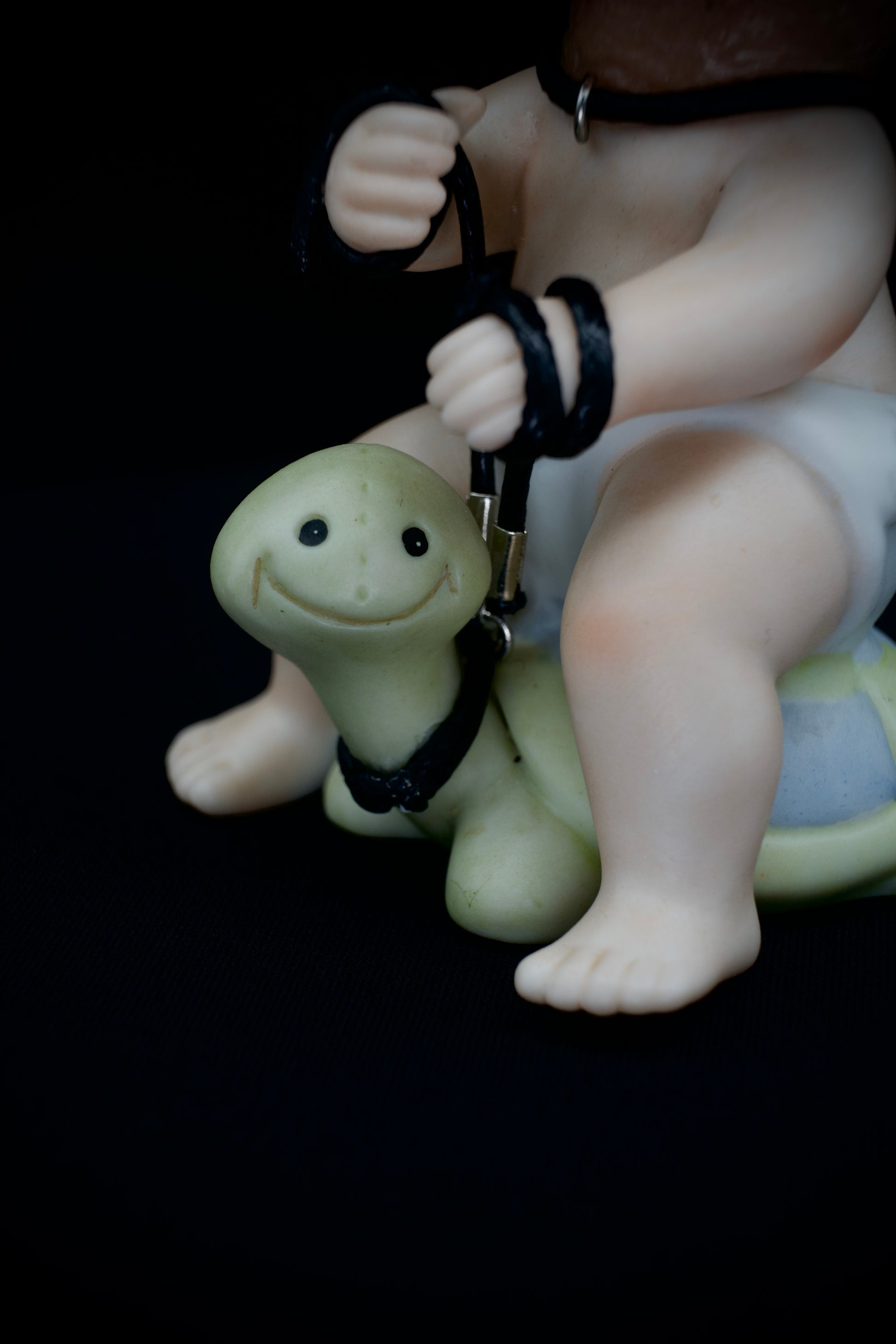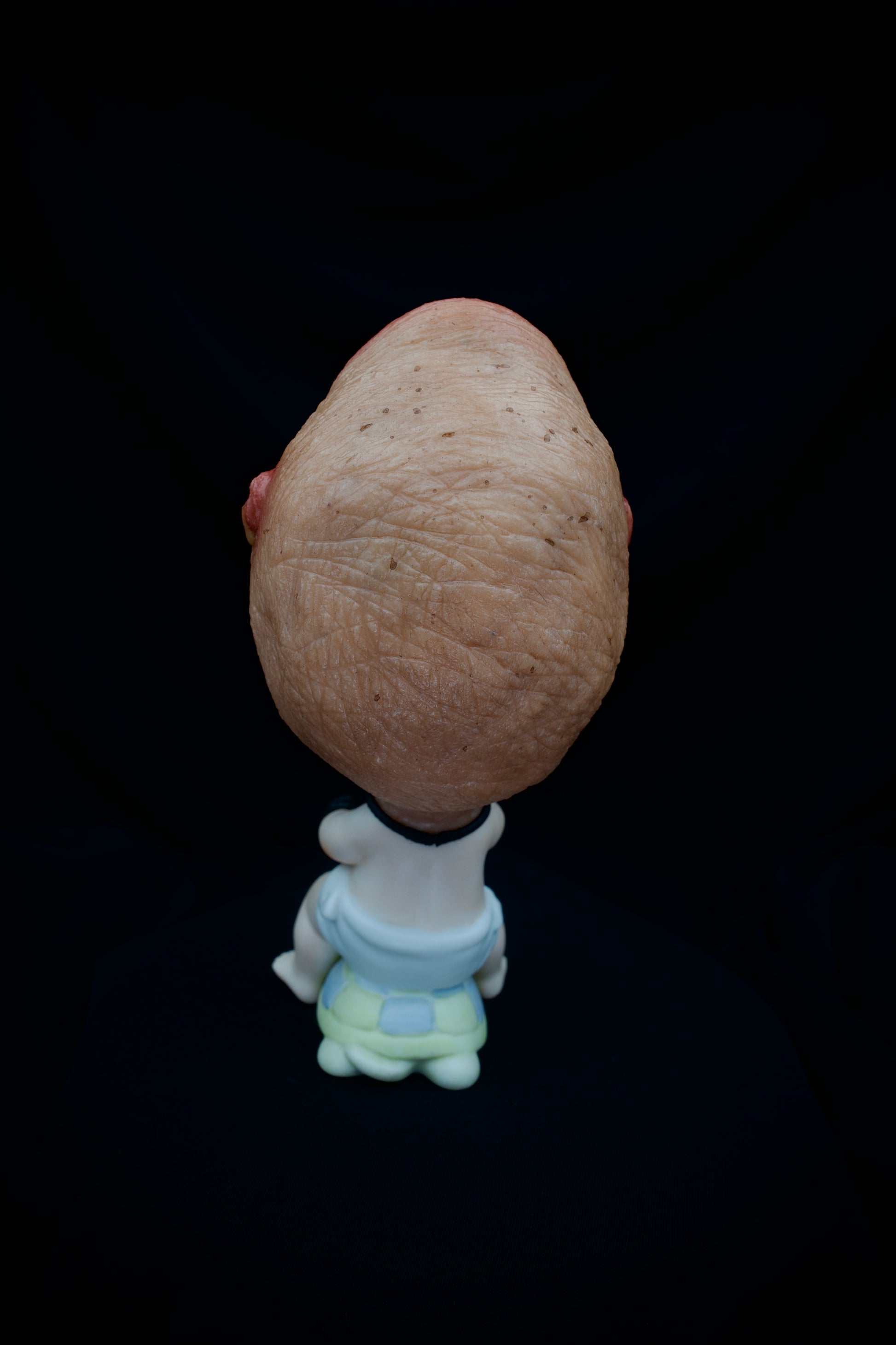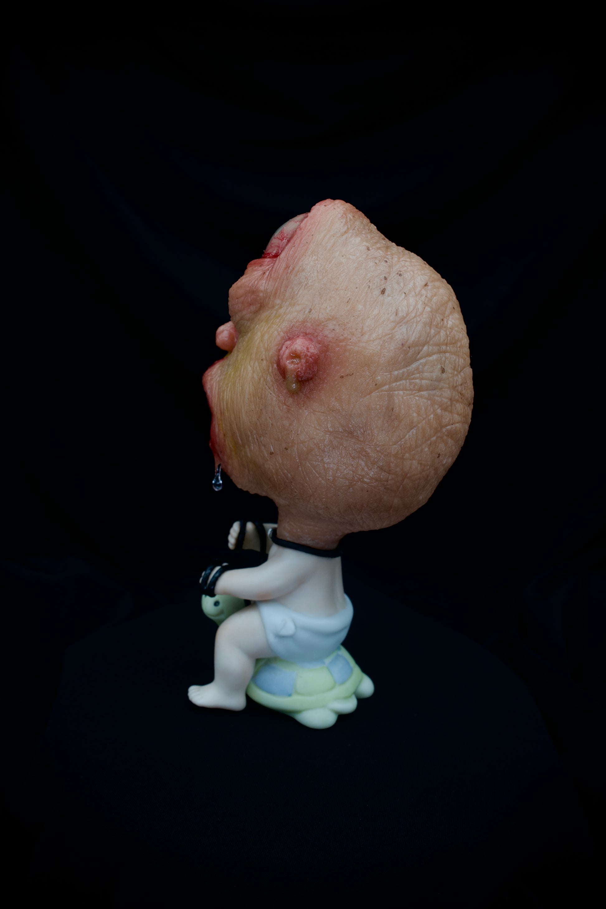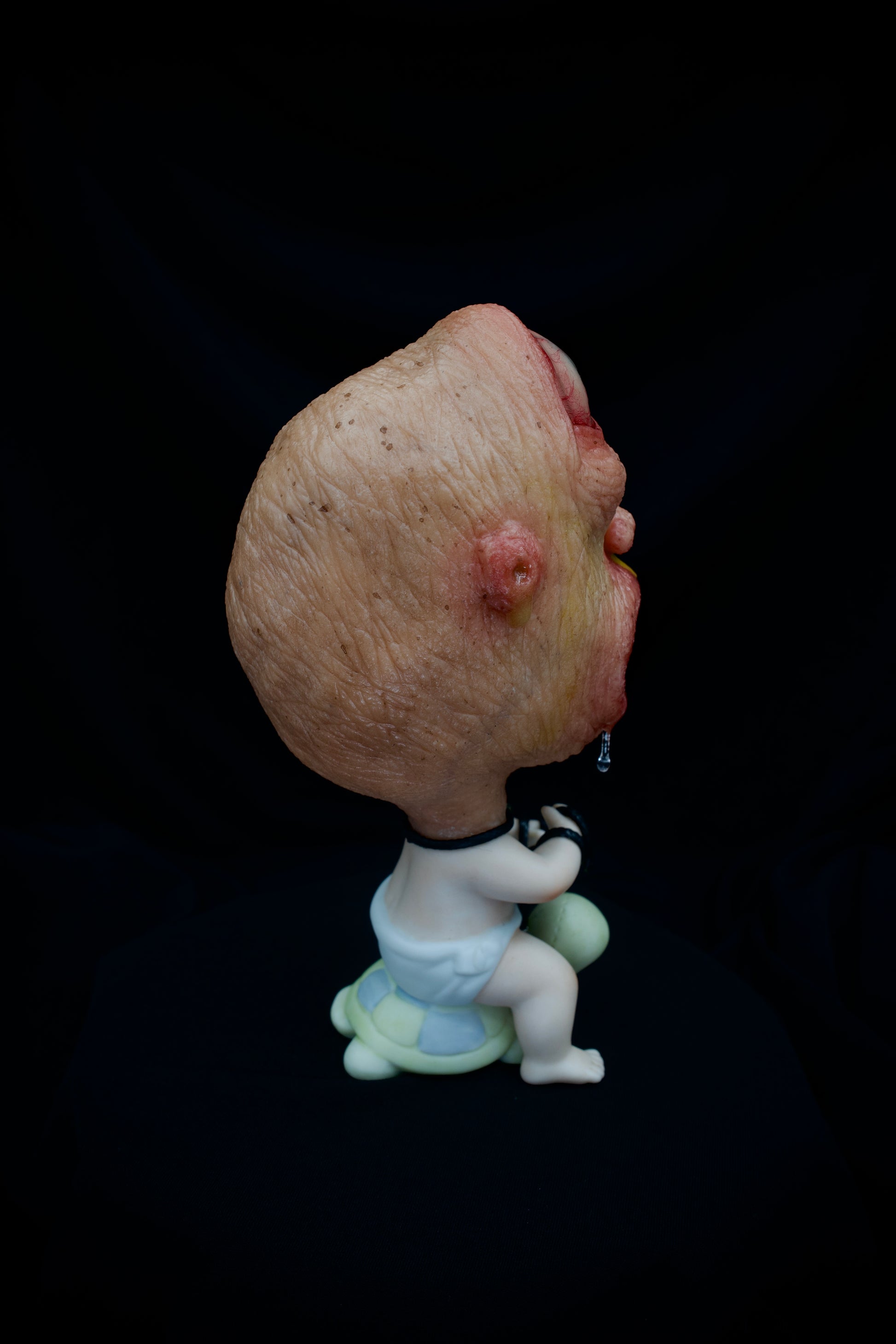 Embrace the extraordinary with "Tom'n Turt," a captivating sculpture that pushes the boundaries of art and imagination. This one-of-a-kind creation is meticulously crafted from a recycled porcelain doll, where the original head has been carefully removed and replaced with a new polymer clay masterpiece.
