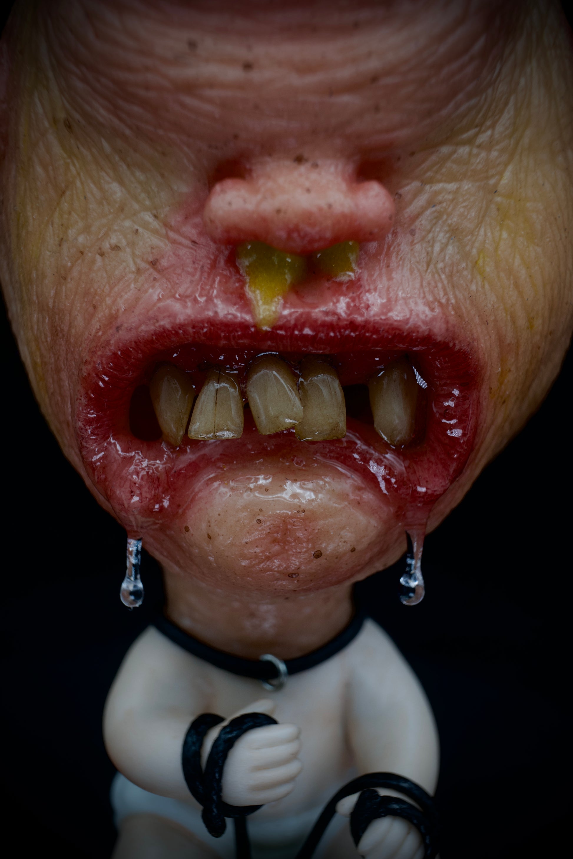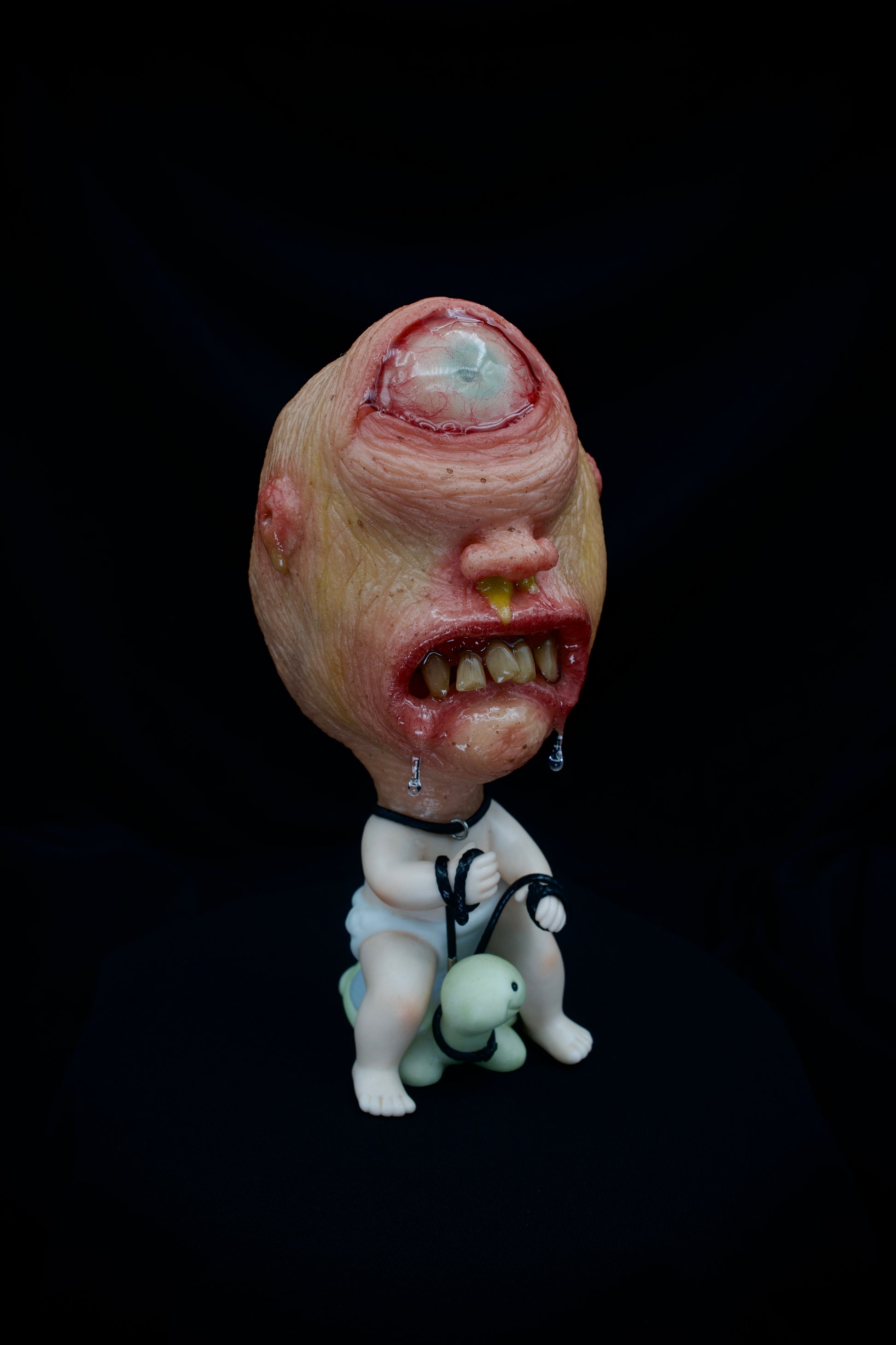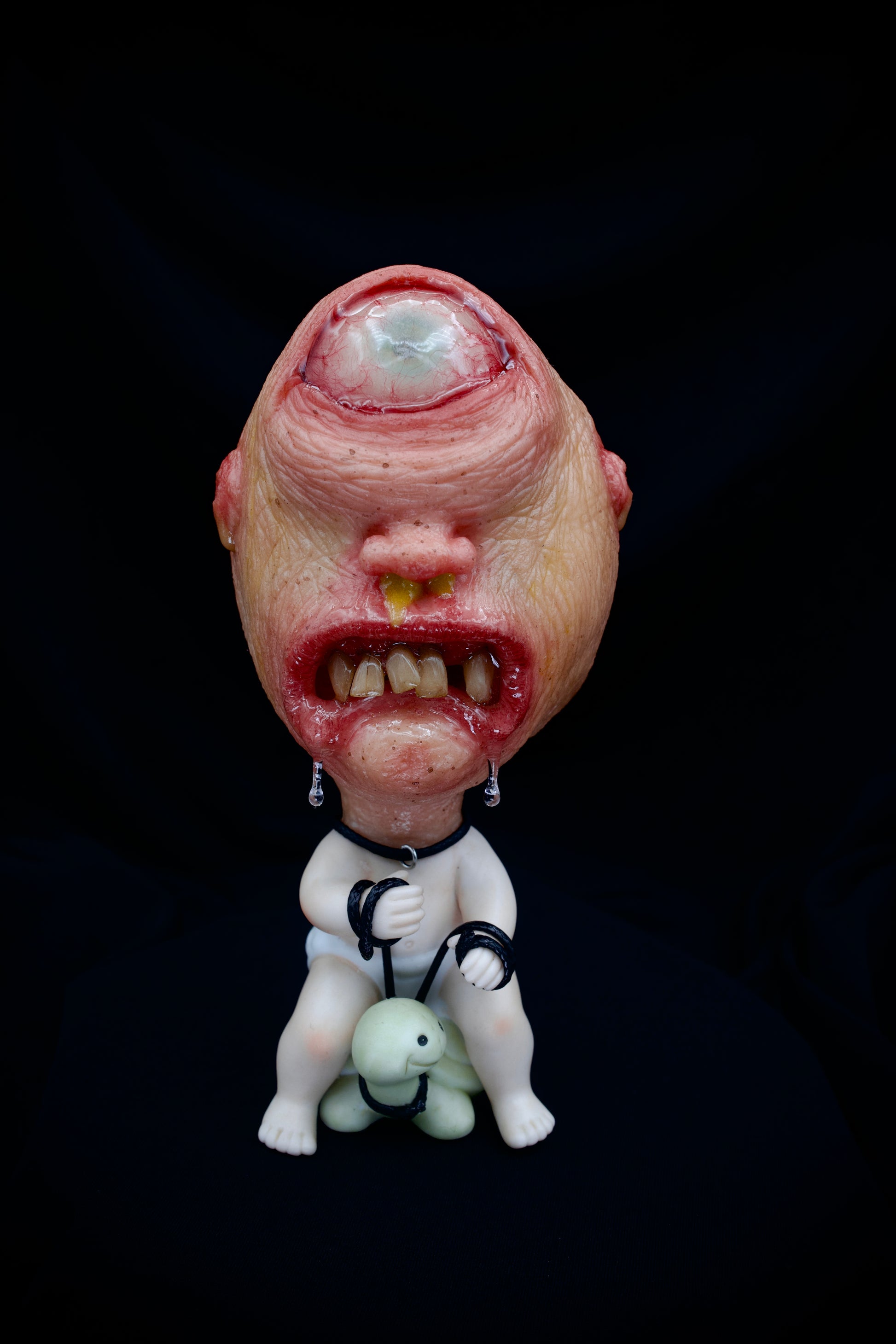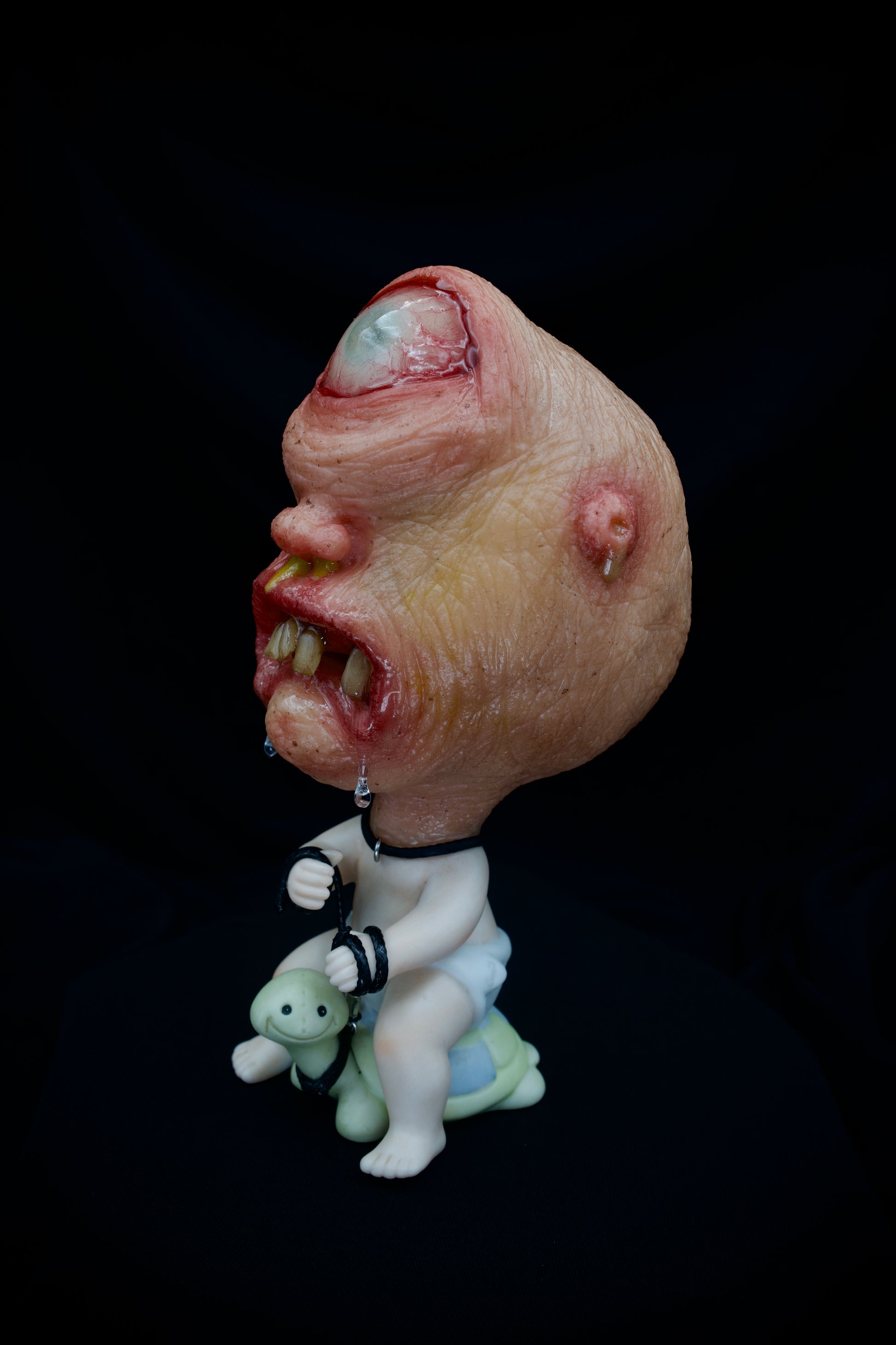 The essence of "Tom'n Turt" lies in its unconventional beauty and whimsical charm. With its cataract cyclops eye, this sculpture captivates and intrigues, drawing you into its world of enchantment. The hand-sculpted teeth add a touch of character, while the inclusion of boogers and ear wax adds a playful and unexpected element.